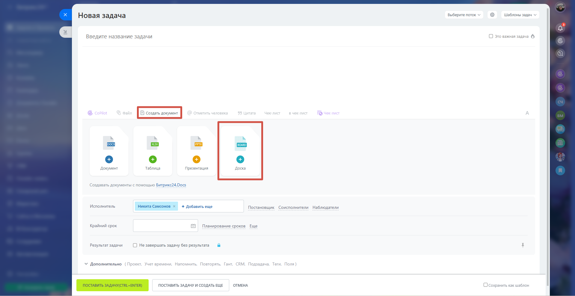 Создавать доски можно не только в соответствующем разделе. Такая возможность доступна и в других частях Битрикс24: в Диске, Документах, Ленте новостей и Задачах.