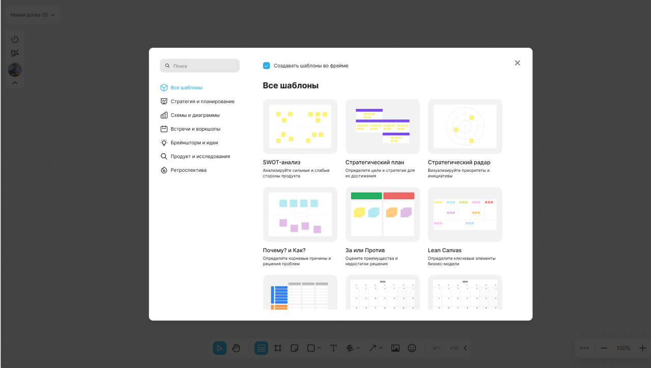 Раздел с досками находится в блоке «Совместная работа». Чтобы создать доску, откройте раздел «Доски» и нажмите кнопку «Создать». Выберите подходящий шаблон или начните с пустой доски, затем настройте ее под задачи вашей команды: добавьте нужные объекты, укажите участников, определите структуру.