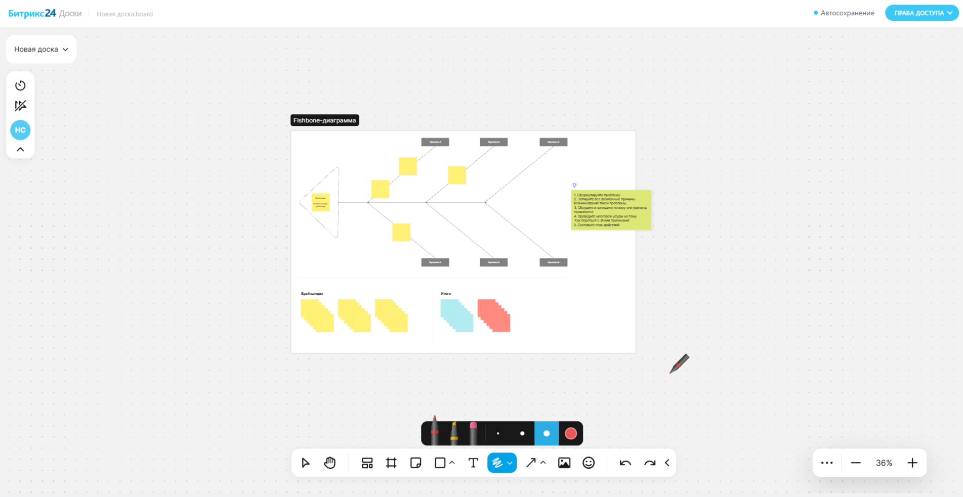 В Досках Битрикс24 можно создавать фреймы — рамки, в которые вы можете группировать контент. Это как слайды, только интерактивные. Можно разбить доску на разделы: например, «идеи», «обсуждение», «выводы».