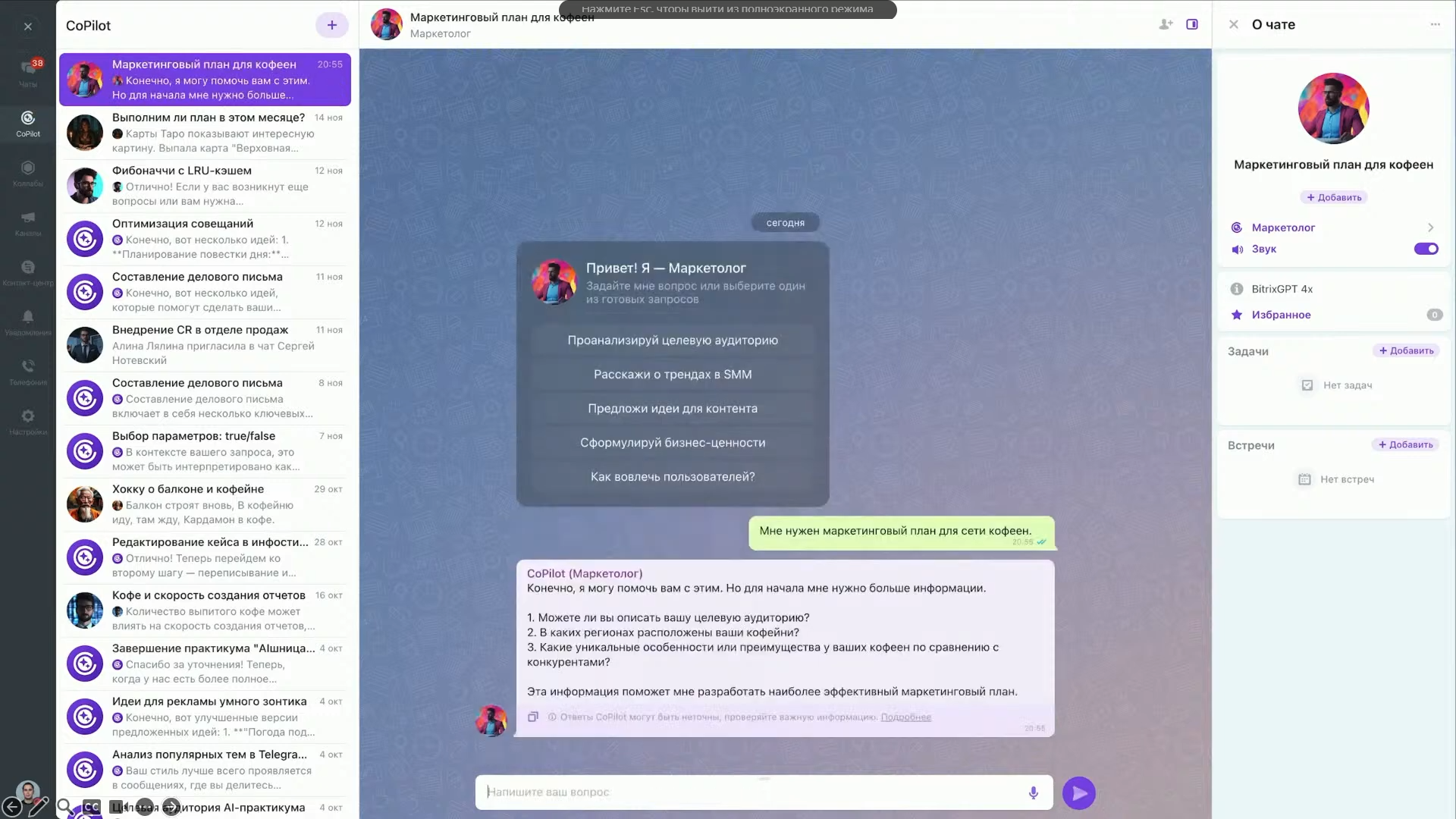Главная цель CoPilot — разгрузить сотрудников от рутинной работы, чтобы они могли сосредоточиться на развитии бизнеса, планировании и общении с клиентами. При этом вы можете ставить задачи на естественном языке, как объяснили бы их коллеге — без сложных команд и специальных формулировок.
