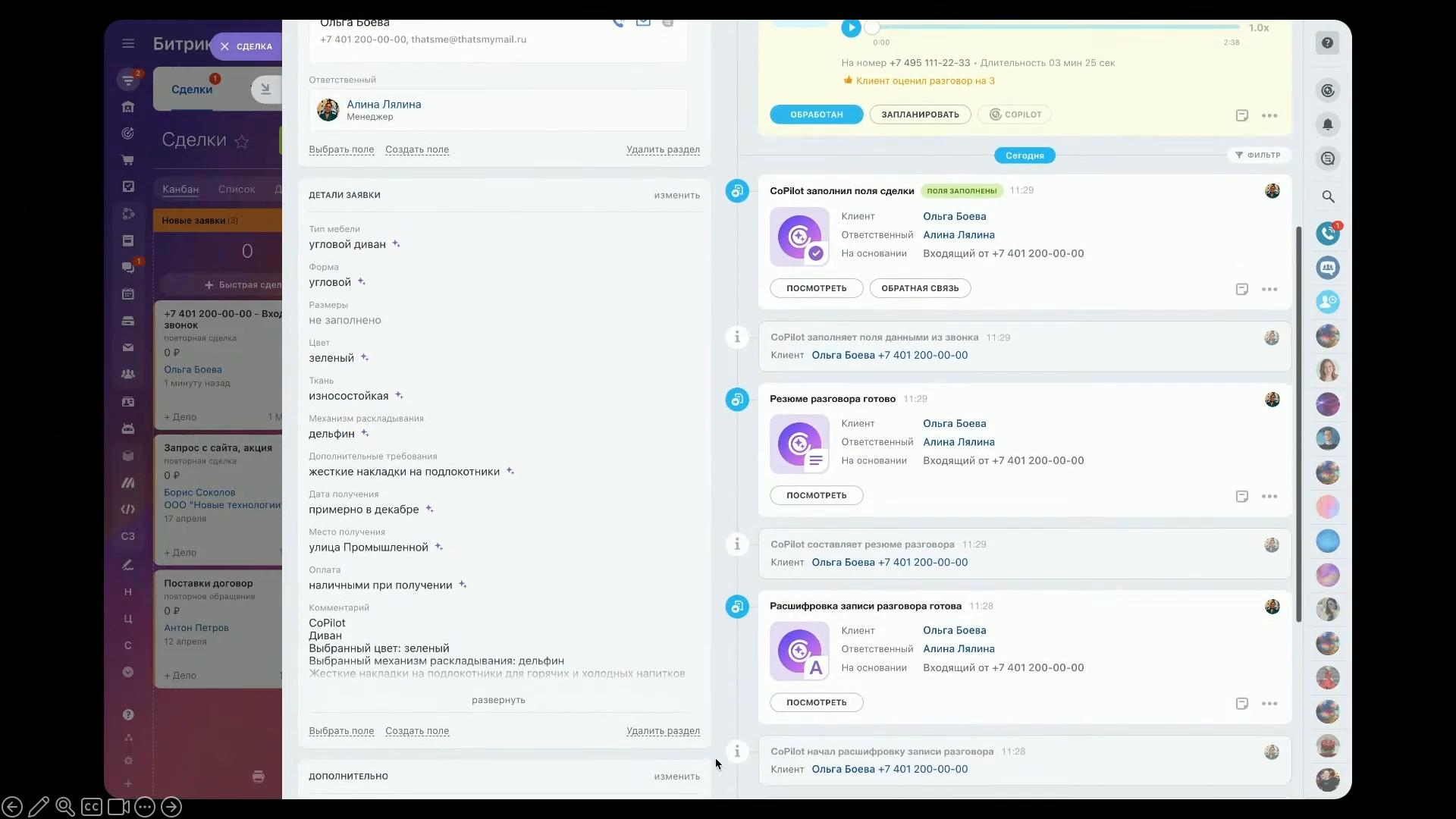 CoPilot помогает автоматизировать работу с звонками и карточками сделок. Вместо того чтобы вручную прослушивать звонки, вы получаете готовый текст с расшифровкой разговора от ИИ, с которым сразу можно работать.