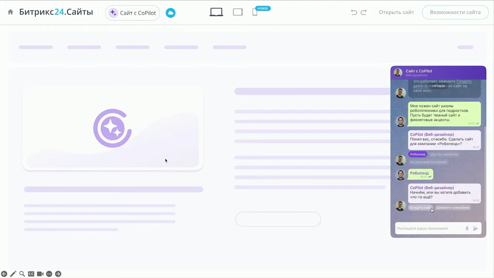 CoPilot в Конструкторе сайтов помогает легко создавать и редактировать сайты без технических навыков. Например, достаточно сказать: «Мне нужен сайт для студии робототехники», и CoPilot сделает такой сайт.
