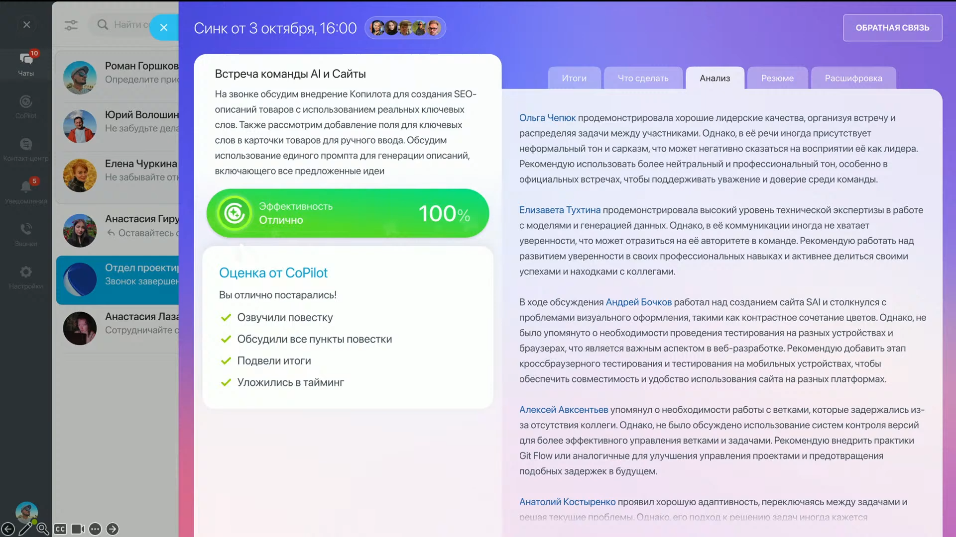 • Рекомендации — советы по улучшению коммуникации и эффективности встреч.