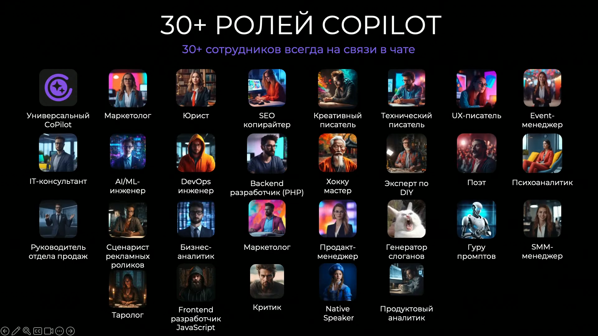 В Битрикс24 доступны более 30 готовых ролей: маркетолог, юрист, SEO-специалист, HR-менеджер, руководитель отдела продаж. CoPilot поможет, например, подготовить рекламную рассылку или договор. Помимо стандартных ролей, пользователи могут создавать свои собственные, сохранять их в библиотеке и делиться с коллегами.