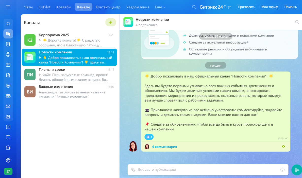 В вашем портале по умолчанию уже есть канал «Новости компании». На него подписаны все сотрудники по умолчанию. Его можно использовать для объявлений, корпоративных новостей и любых сообщений, которые должны видеть все.