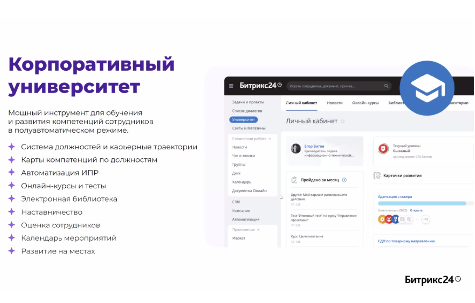 Модуль «Корпоративный университет» интегрирован в интранет-портал и дает возможность каждому сотруднику компании получить свой индивидуальный план развития с первого дня работы.