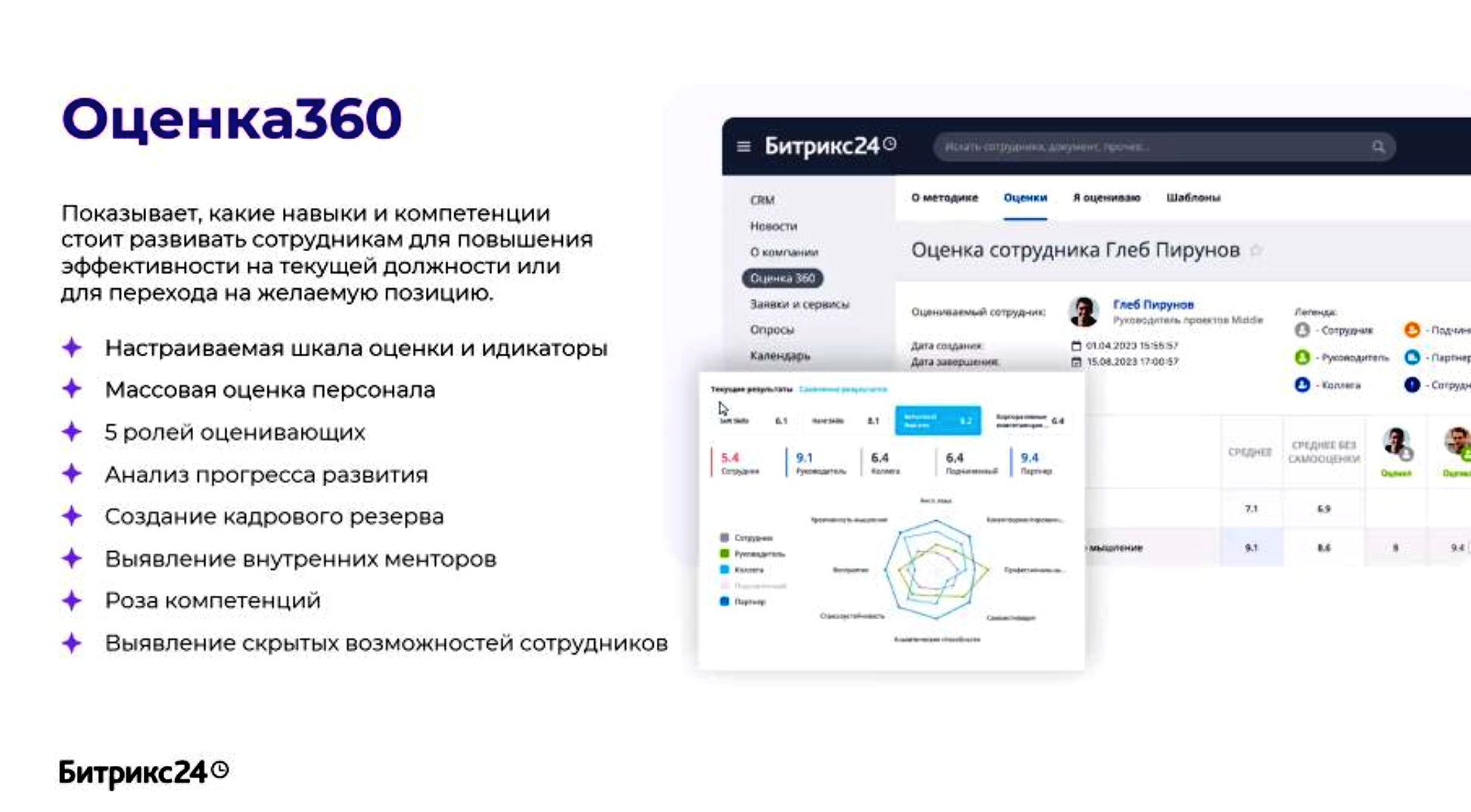 Всесторонняя оценка деловых качеств сотрудников. Оценка360 является незаменимым инструментом для определения того, какие навыки и компетенции нужно развивать у сотрудника, чтобы он стал более эффективным на своей текущей должности или смог перейти на желаемую позицию. Основой оценки являются отзывы, которые могут быть даны как самим сотрудником, так и его руководителем и клиентами. Это гарантирует объективность и точность в оценке компетенций человека. Оценка360 помогает развивать навыки и умения каждого сотрудника, что в свою очередь способствует росту компании.