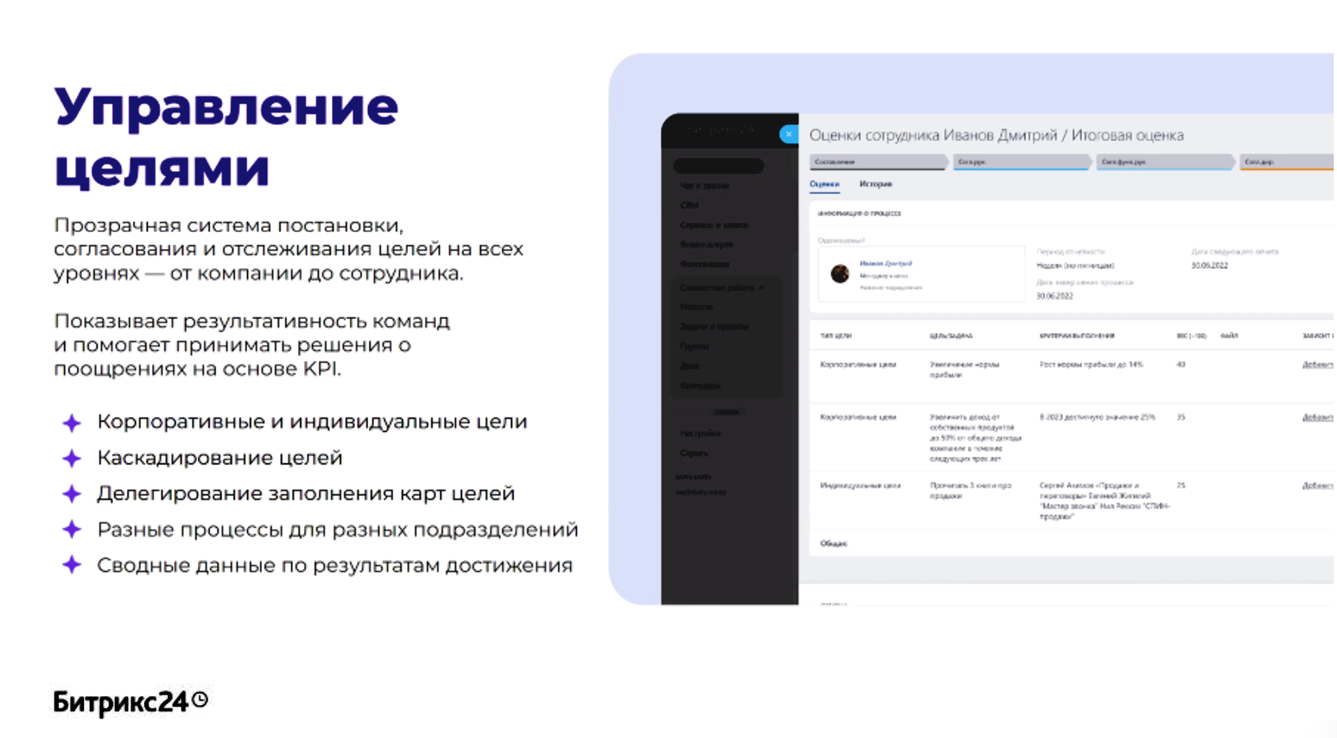 Удобный способ ставить, согласовывать цели и отслеживать их выполнение. Б24 HRM обеспечивает прозрачность в постановке, согласовании и отслеживании целей на всех уровнях компании, начиная от руководства и заканчивая сотрудниками. Каждый член команды понимает свою роль и вклад в общее дело. Система показывает результативность работы команды и помогает принимать решения о вознаграждениях на основе ключевых показателей эффективности.